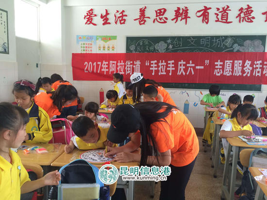 昆明信息港讯 通讯员李思羽 5月31日,昆明经开区阿拉街道在普照、石坝、阿拉、高坡、海子、清水6个社区及云缨小学同时开展以“手拉手、庆六一”为主题的志愿服务活动。