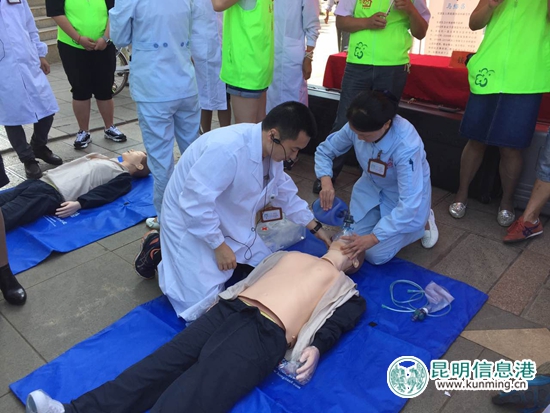 为了方便居民们选择对应的服务,活动现场设有义诊区和综合宣传两大服务区,由官渡区人民医院组成的40余名内科、中医科、康复科、五官科的专家们仔细地为居民看诊,耐心解答居民有关医疗方面的问题,记者在现场还注意到,在义诊区,医疗救援团队特别设置了一个心肺复苏点,现场教广大的居民如何徒手心肺复苏。市民李羿潮先生第一个就报名学习,他告诉记者:“我觉得学习心肺复苏这个就很好,在遇到有人突发意外的情况,可以帮助他们,为他们赢得更多的抢救时间。”