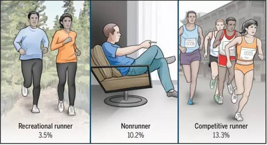 研究发现,只有3.5%的健身跑步者有膝盖或者髋部的关节炎,不论男女都是这个数据。那些喜欢久坐或者不跑步的人,10.2%的人有膝盖或者髋部的关节炎。那些参加竞技跑步的人(包括经常参加竞技比赛和专业水平的运动员),膝盖或者髋部关节炎的发生率稍稍比普通人高一点,但也不算特别高,为13.3%。