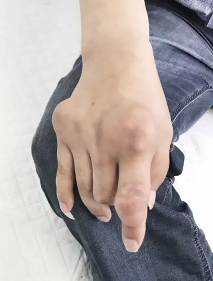 近日,在东方医院,记者见到了正在进行治疗的小王。他躺在病床上,双手指关节处异常凸起,疙疙瘩瘩长满“石头”,十根手指已无法伸直。不仅如此,手肘、膝盖等关节处,也长有同样的“石头”,大的犹如鸡蛋般,隆起在关节上。