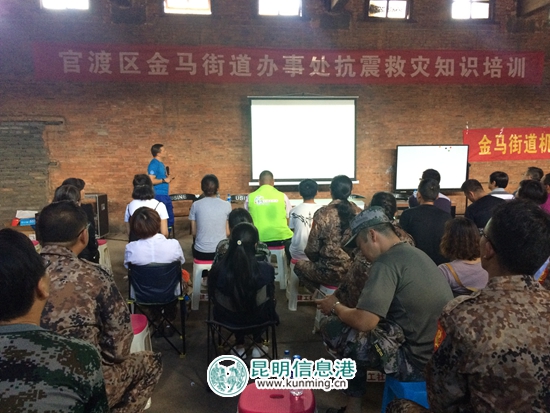 昆明信息港讯 通讯员郭武辉 8月22日,官渡区金马街道组织机关干部、社区救援人员等100多人参加了防震减灾知识培训和救援演练。
