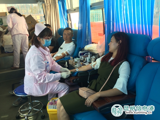一上午,昆明血液中心的献血车就来到了金马街道办事处的大院,来自街道机关和辖区10个社区的干部职工们陆续来到了献血车上,填写无偿献血登记表、体检、采血、化验合格后就可以开始抽血,最低200毫升,最高500毫升,干部职工争相参与到活动中来。