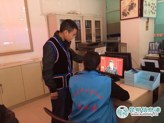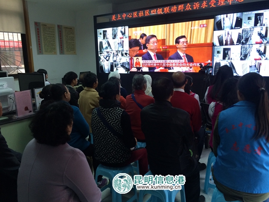在官渡区关上中心区社区,党员、少数民族代表、社区干部和工作人员在社区办公场所、辖区公共单位等多个场合,通过液晶大屏、电脑、手机等多种形式观看了盛会,在社区四级联动大厅里,大家早早地来到了这里,全神贯注地听取会议精神,并不时记下关键信息。针对习近平同志在会上所作的工作报告,广大干部群众深切感受到国强民富,天朗气清,引发了深刻的思想共鸣,满满的都是幸福感和撸起袖子加油干的热情。