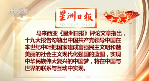 马来西亚《星洲日报》评论文章指出,十九大报告勾勒出中国共产党领导中国在本世纪中叶把国家建成富强民主文明和谐美丽的社会主义现代化强国的蓝图,实现中华民族伟大复兴的中国梦,将在中国与世界的联系与互动中实现。