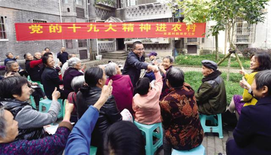 11月6日,党的十九大代表、市委宣讲团成员、重庆市江津区委书记程志毅来到江津鼎山街道双万村,结合自己参加十九大的经历,用通俗易懂的语言向群众进行了面对面宣讲,把党的十九大精神及时准确地传达到基层。