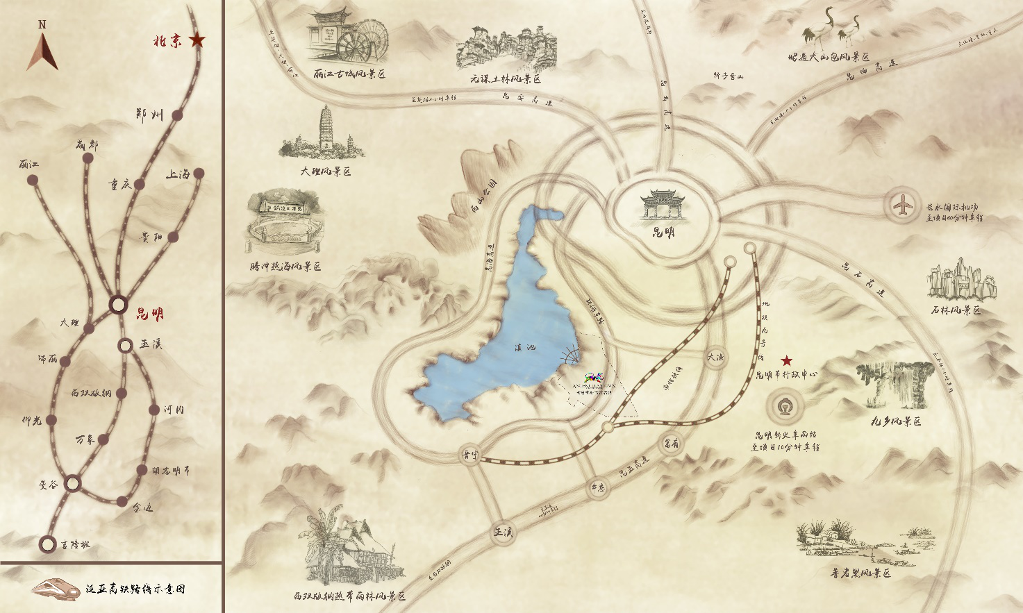 七彩云南古滇名城属上风上水的滇池东南沿岸,位于2000多年前的古滇王国都城遗址范围内,距离昆明主城区35公里,距离长水国际机场70公里,距离高铁站10公里,交通便捷,陆路、轨道、水路交通体系俱全。