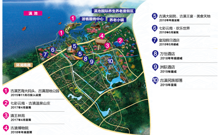 七彩云南欢乐世界主题公园、皇冠假日酒店将于2018年6月建成投入运营;古滇大剧院、古滇王宴美食广场、万怡酒店将于2018年年底建成投入使用;古滇民族部落、七彩云南购物广场、洲际酒店将于2019年年底建成投入使用。