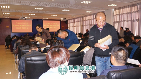 在2017年度落实党风廉政建设责任制检查考核汇报会上,昆明市委相关领导阐明了本次考核的意义和程序。官渡区委书记和丽川代表区领导班子汇报官渡区2017年度落实党风廉政建设责任制情况。区委书记和丽川和区长王忠面向全体与会人员作了个人述责述廉报告。会议最后阶段,全体与会人员填写了测评表,对昆明市2017年度领导班子落实党风廉政建设责任制和领导干部述责述廉进行了民主测评。