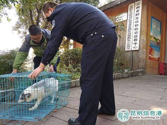 经民警观察,该动物应是一只白狐狸,经走访周边群众,均不了解该狐狸的主人,民警随即将狐狸送到云南省野生动物收容救助中心进行救助。