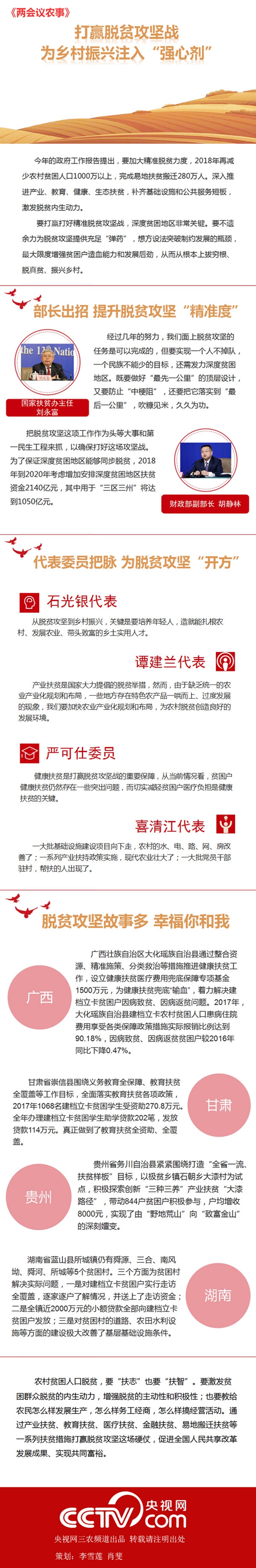 央视网消息:贫困不仅会限制农民的想象力,更会拖慢我国实现乡村振兴的步伐。确保到2020年农村贫困人口实现脱贫,是我国全面建成小康社会最艰巨的任务,更是乡村振兴的必要前提,要实现脱真贫、真脱贫是摆在每一个贫困地区面前的难题。如何短时间内解决扶贫领域突出问题,啃下深度贫困地区的“硬骨头”?跟随小编一起来听听部长如何解答,看看两会代表委员如何建言,以及各地的成功经验。