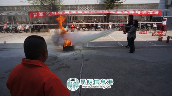 在演练的第二阶段,中国电信昆明官渡分公司特邀的消防人员现场为参训人员讲解灭火器的知识,演示灭火器的使用,全体参演人员现场使用灭火器进行灭火练习。