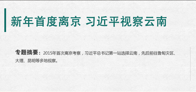 - 2015年首次离京考察,习近平选在云南鲁甸地震灾区。1月19日下午,习近平乘车一路颠簸直奔峡谷中的震中龙头山镇,来到原镇政府所在的遗址,走进满是废墟的院子,询问地震伤亡、抗震救灾情况。