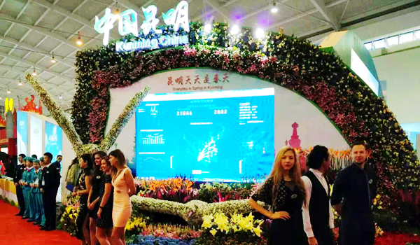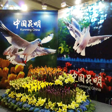 走进昆明展区,就像走进一片鲜花的海洋。展区用十多种鲜花做造型,营造出一片春城的景象。