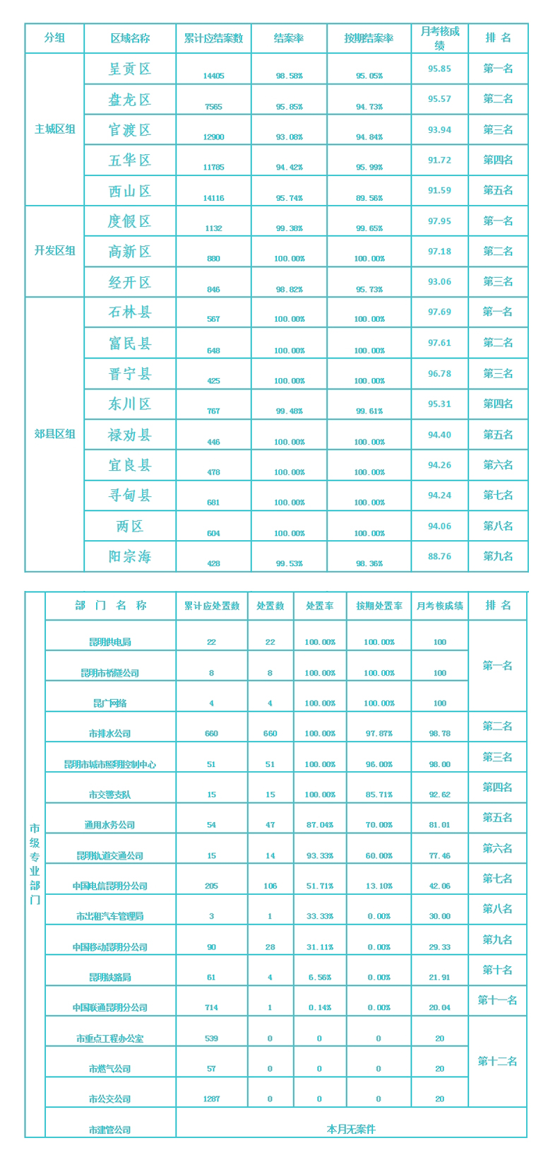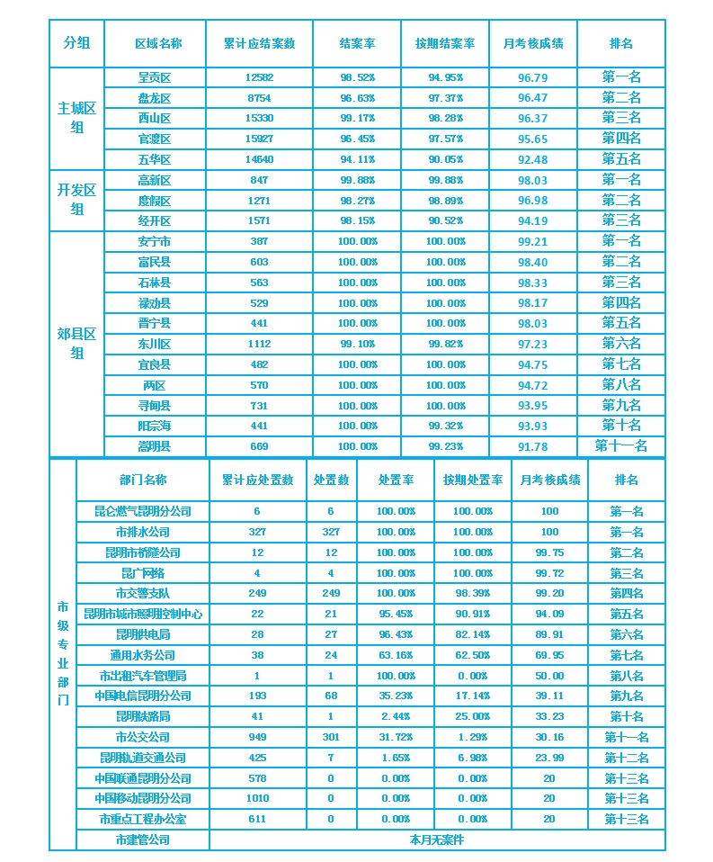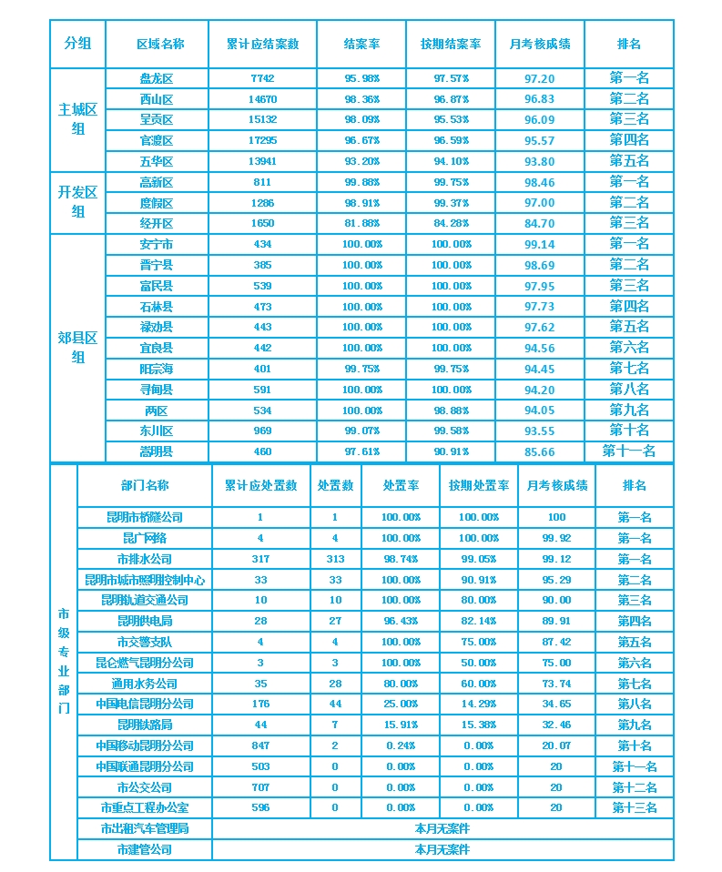 根据《昆明市城市综合管理考核办法》,昆明市数字化城市管理办公室为昆明市城市综合管理工作领导小组下设办公室,代表昆明市政府对辖属各县(市)区城市综合管理问题行使监督考核职能。我办自2010年起对安宁市和嵩明县城市综合管理问题进行监督考核,直到安宁市和嵩明县划归滇中产业集聚区(新区)后停止相关考核工作。