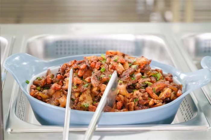 学校食堂本着学生至上、安全第一、热情服务的原则,服务于广大师生,午餐和晚餐的菜品由营养师和厨师根据季节气候来制定,午餐和晚餐分别提供2荤2素一汤(汤免费),每天菜品不重样。学校食堂每天采购新鲜食材,验收后现场分拣保持传统手工加工烹制菜品,不使用全自动及半自动化机械生产加工。