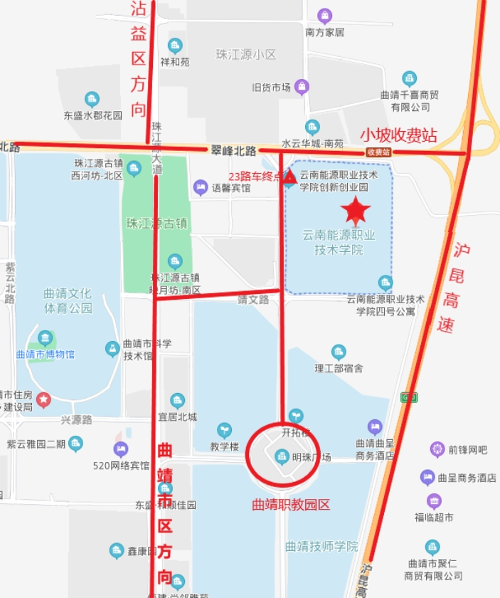 麒麟校区位于曲靖市职教园区文苑北路,市内可乘23路公交车至终点站(能源学院)步行到学校。