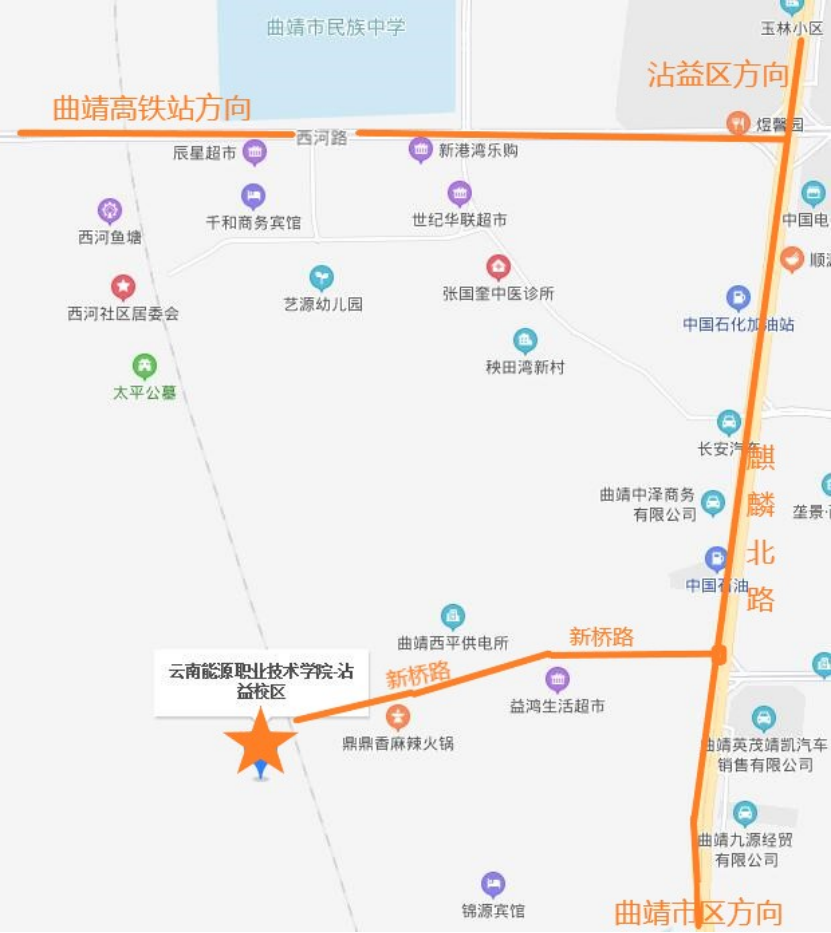 沾益校区位于曲靖市沾益区龙华街道西河社区,市内可乘33路公交车(小路口站)下车、32路公交车(汽车城站)下车后步行约1.6公里至学校。