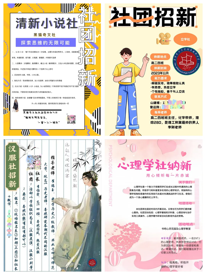 昆理工附高确立了社团引领、五育并举的学生自主发展思想,深度挖掘学生社团内涵。以专长教师特色专业化指导,遵循社团导师“精英化”,社团管理“精细化”,社团类型“发展化”,社团成果“规模化”,打造特色化社团,给学生们提供服务同学、锻炼自我、提高个人综合素质的舞台。