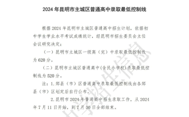 昆明市主城区一级高(完)中录取最低控制线620分!昆明市主城区普通高中(含民办学校)录取最低控制线为520分!