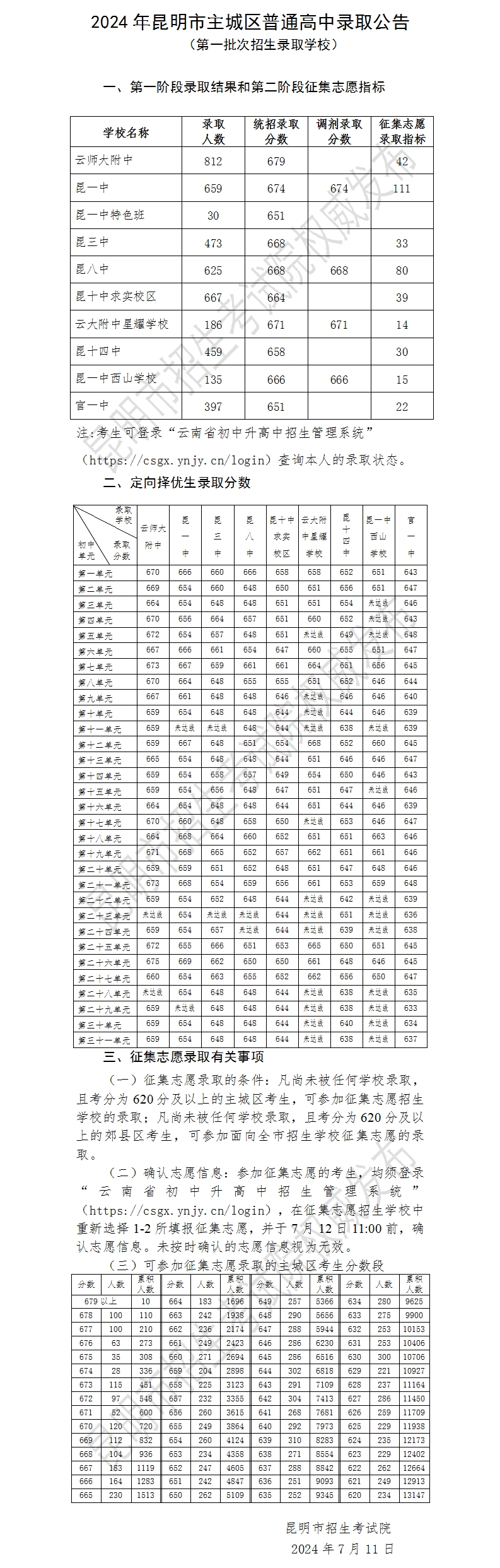 昆明市招生考试院发布2024年昆明市主城区普通高中录取公告(第一批次招生录取学校)