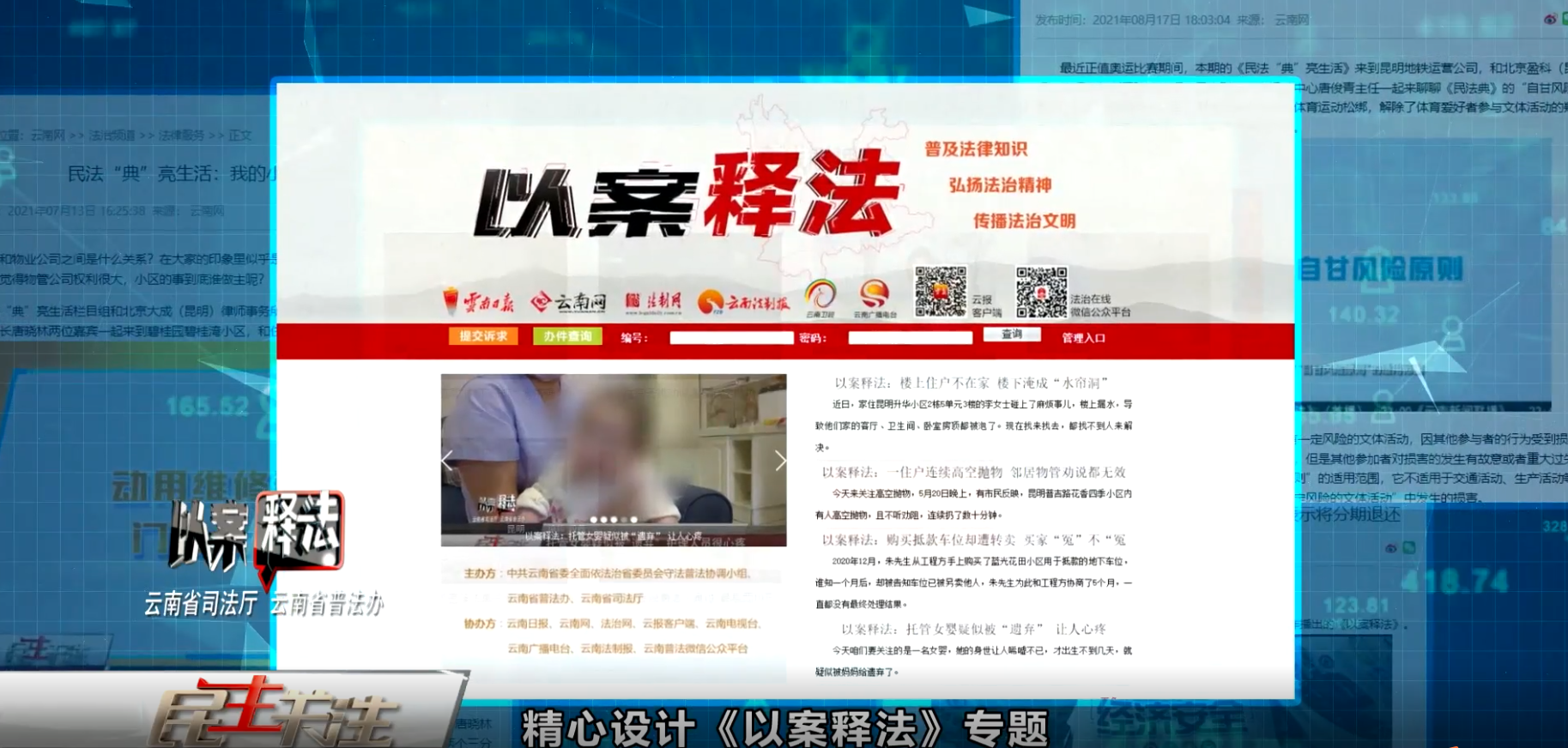 聚焦热点话题,结合生活中发生的事件、案例,用通俗、简洁的语言,开展以案释法活动。栏目采用“案例采编+演播室连线嘉宾”的方式,邀请法官、检察官、执法人员、律师等走进演播室释法说理,突出释法环节,深受广大观众喜爱。
