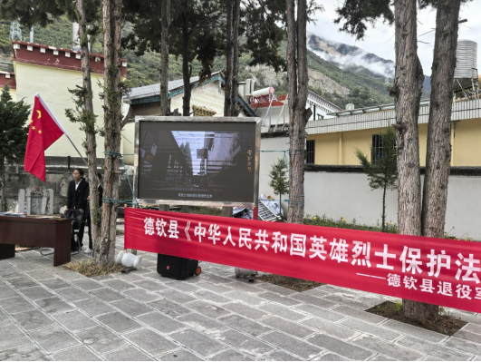 宣传专题横幅,播放中华人民共和国英雄烈士保护法宣传视频