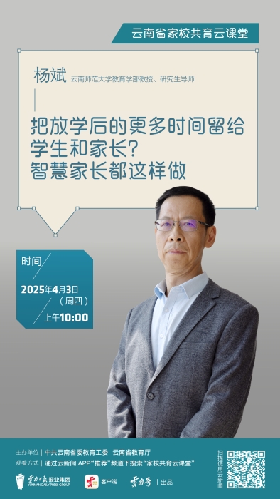 4月3日上午10:00,云南家校共育云课堂第十五期——《把放学后的更多时间留给学生和家长?智慧家长都这样做》在云新闻客户端上线,本期邀请了云南师范大学教育学部教授,研究生导师杨斌,谈一谈义务教育非寄宿制学校不统一安排晚自习后,家庭教育要如何补位?