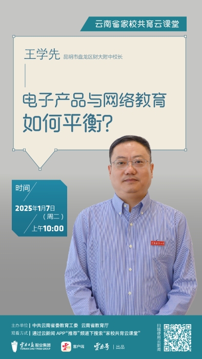 2025年1月7日上午10:00,云南家校共育云课堂第十二期——《电子产品与网络教育,如何平衡?》在云新闻客户端上线,本期邀请了昆明市盘龙区财大附中校长王学先,谈一谈电子产品与网络教育在家庭教育中的新挑战与应对策略。