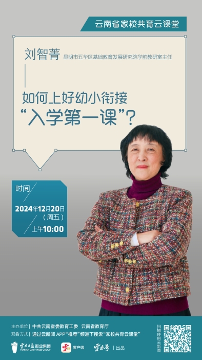 2024年12月20日上午10:00,云南家校共育云课堂第十一期——《如何上好幼小衔接“入学第一课”?》在云新闻客户端上线,本期邀请了昆明市五华区基础教育发展研究院学前教研室主任刘智菁老师与你一起探讨,帮助孩子做好幼小衔接的“四大准备”。