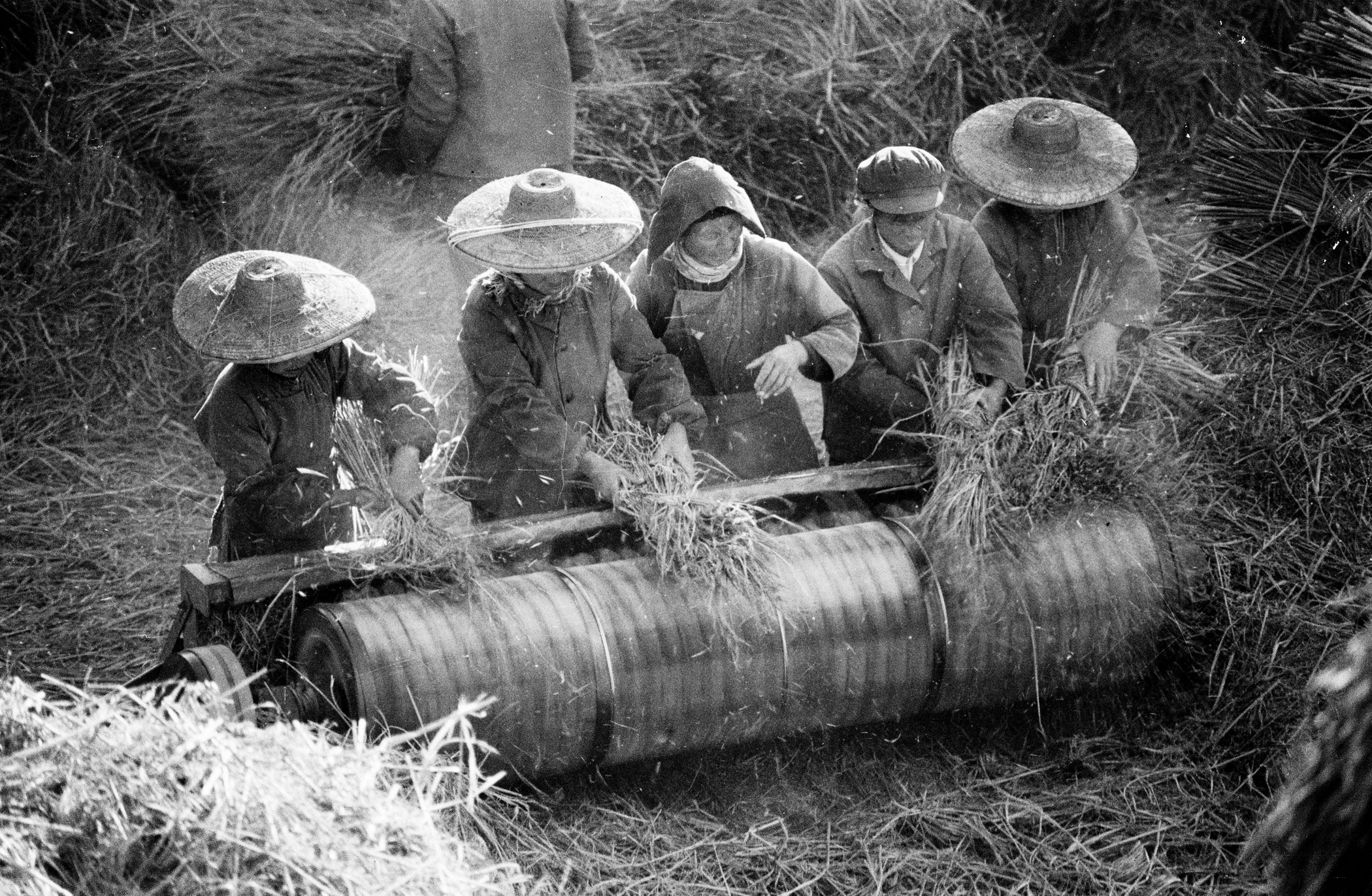 1973年,人民公社时期,昆明市官渡区的农民用电动脱粒机集体打谷。刘建明摄