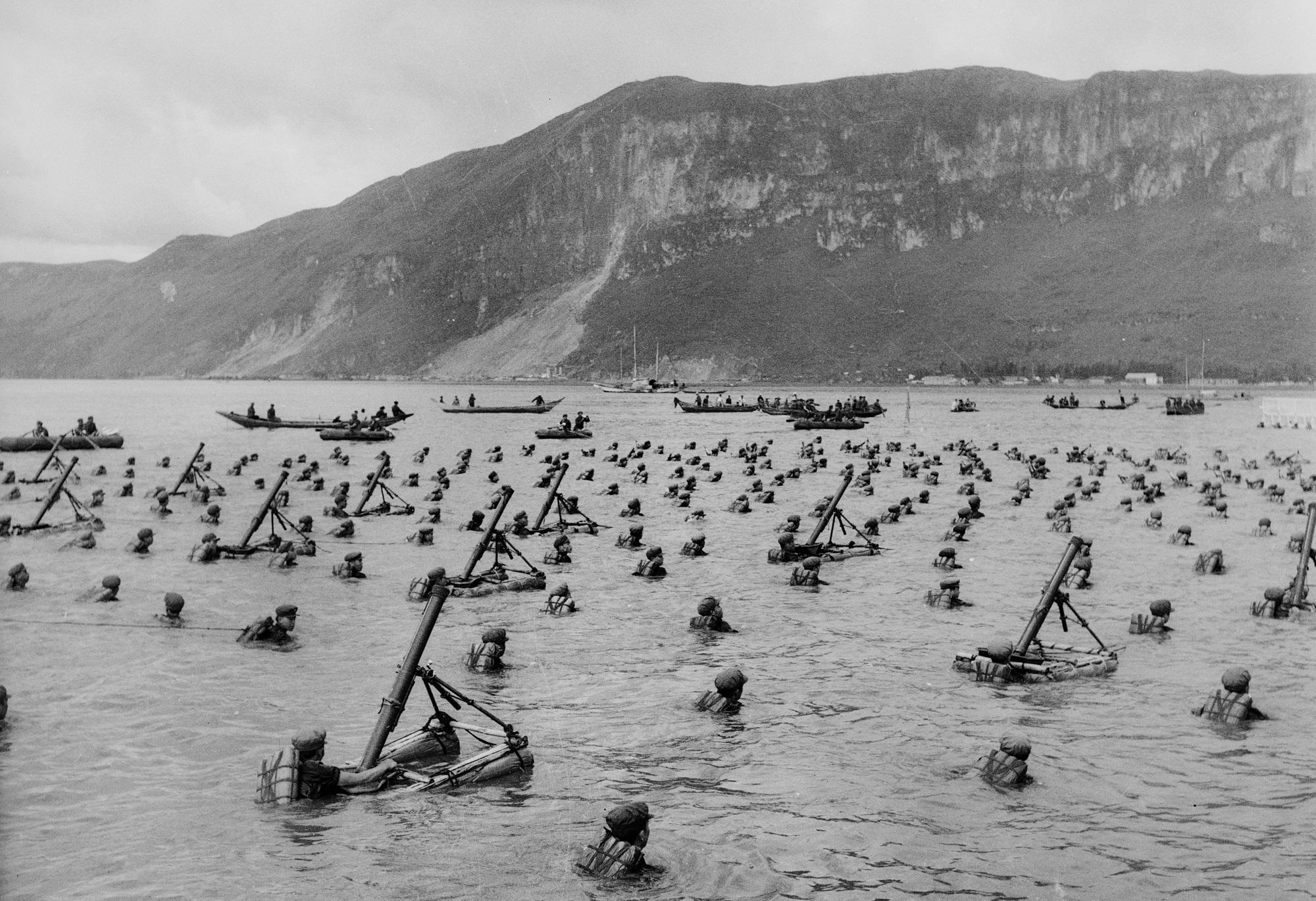 1976年7月16日,昆明市纪念毛泽东主席畅游长江十周年的活动中,驻昆部队官兵武装泅渡滇池。刘建明摄