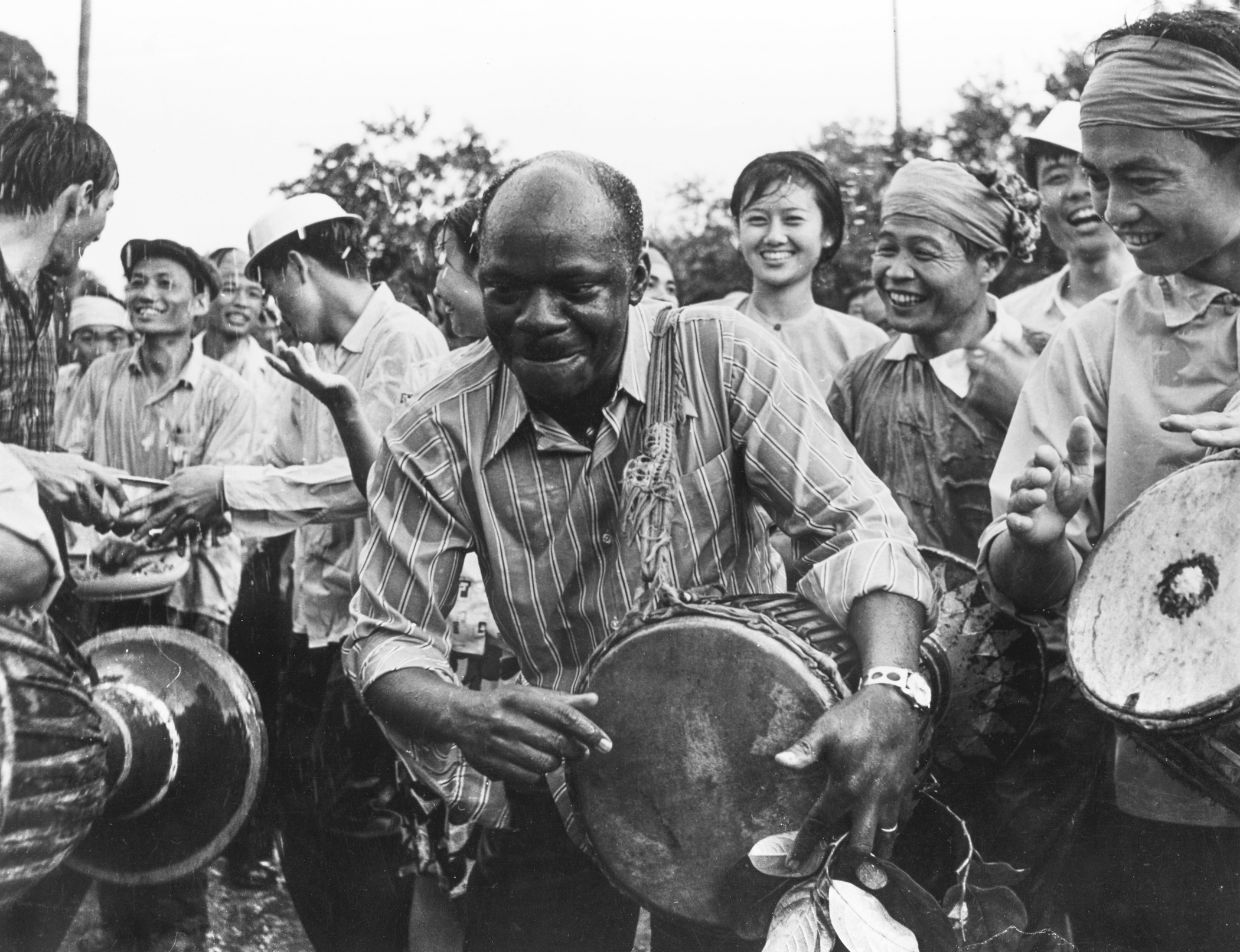 1978年,在景洪参加泼水节的非洲朋友与傣族青年敲起了傣家的象脚鼓。-刘建明 摄