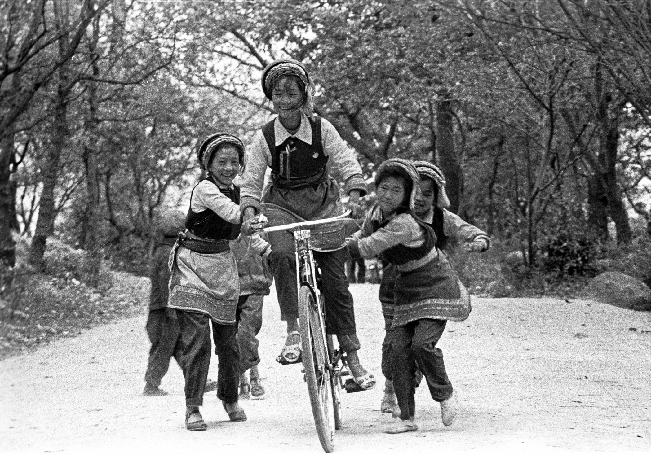 1982年,自行车开始成为农村的交通工具,大理喜洲镇的几个白族姑娘在一起学骑自行车。刘建明摄