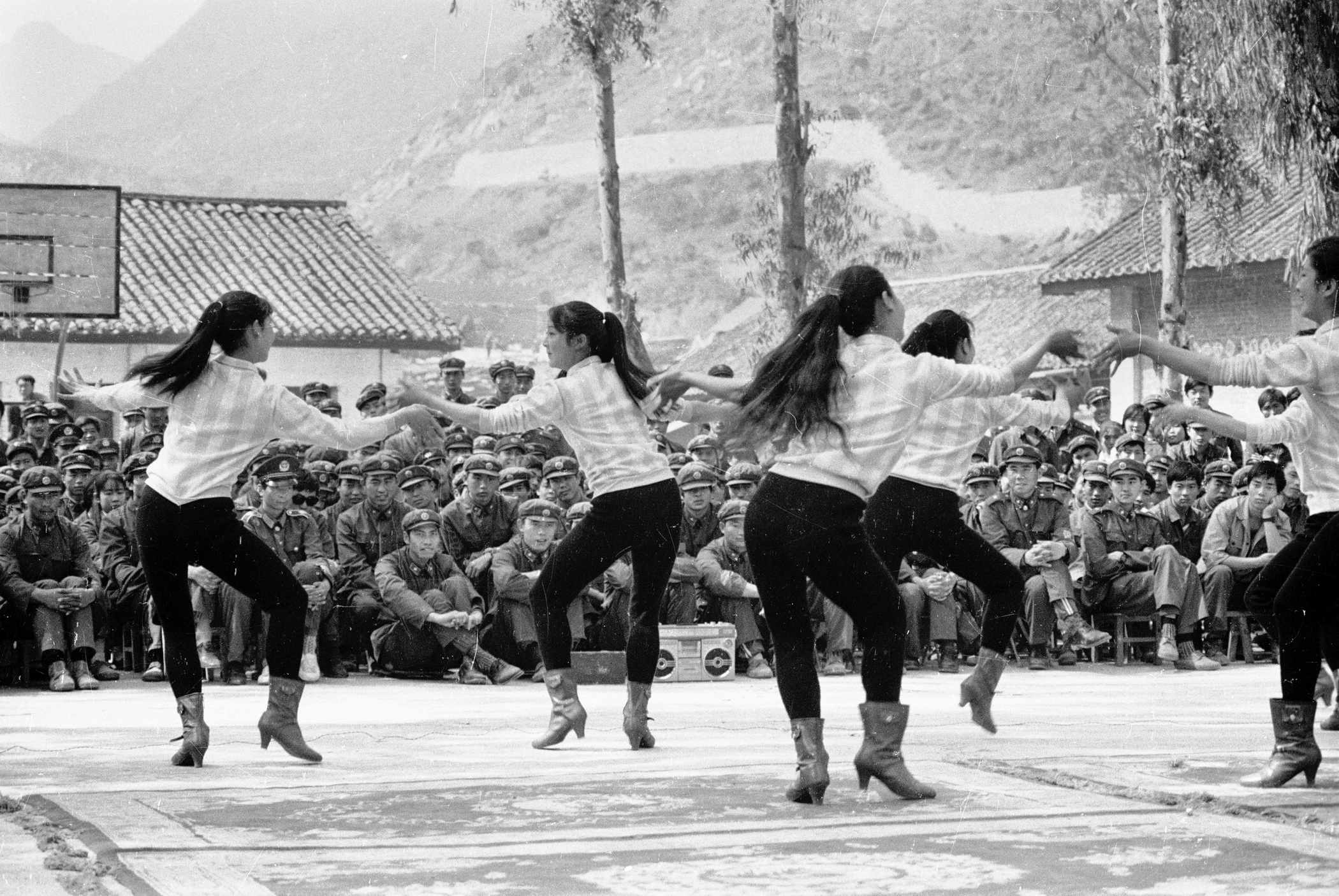 1986年,昆明市文艺学校的学生为麻栗坡老山前线官兵慰问演出,激情奔放的迪斯科洋溢着青春气息。刘建明摄