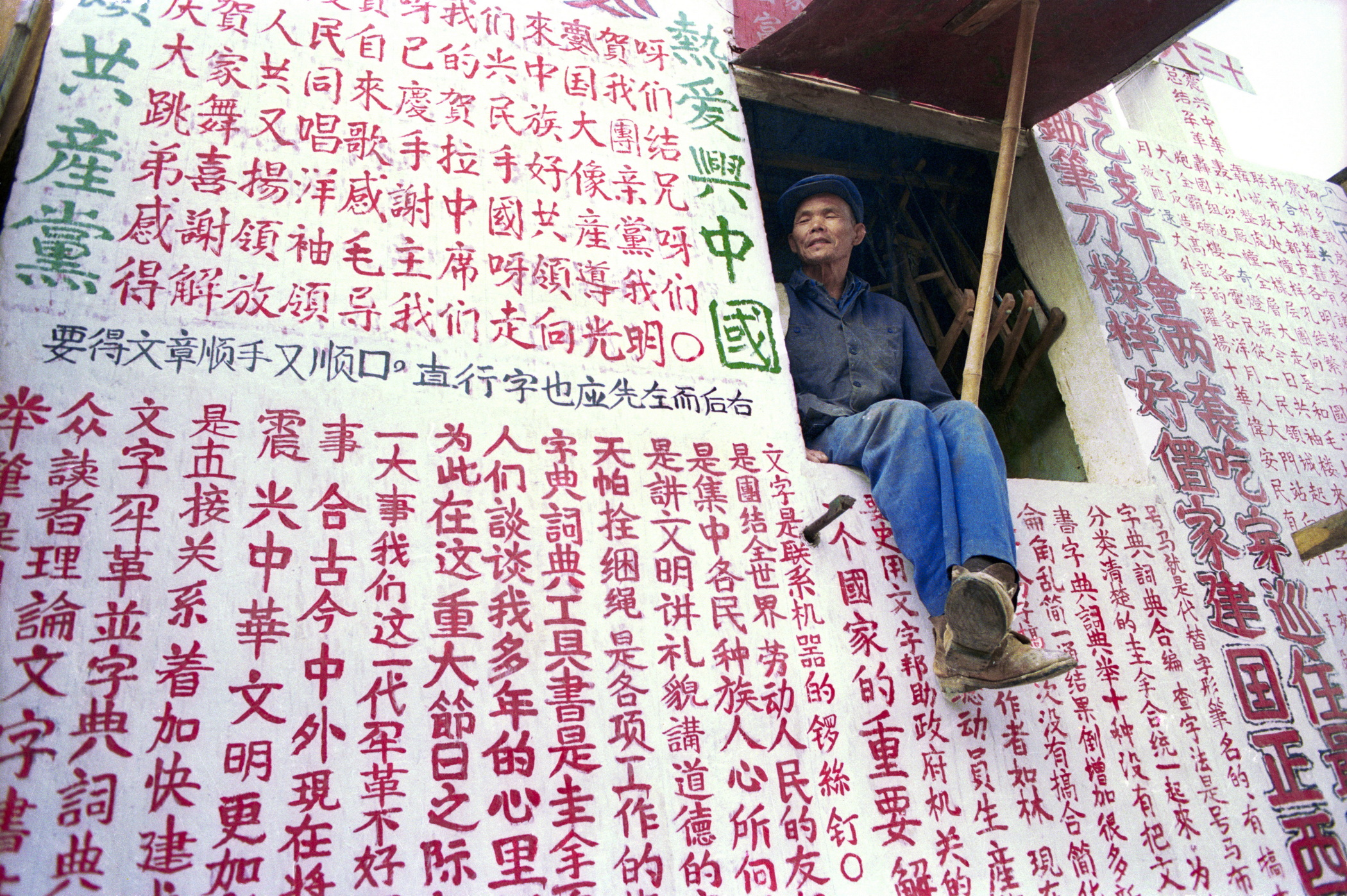 1989年,在元江县城,这位自称“民间文字工作者”的老人,在居室外写满自创的各种词语。刘建明摄