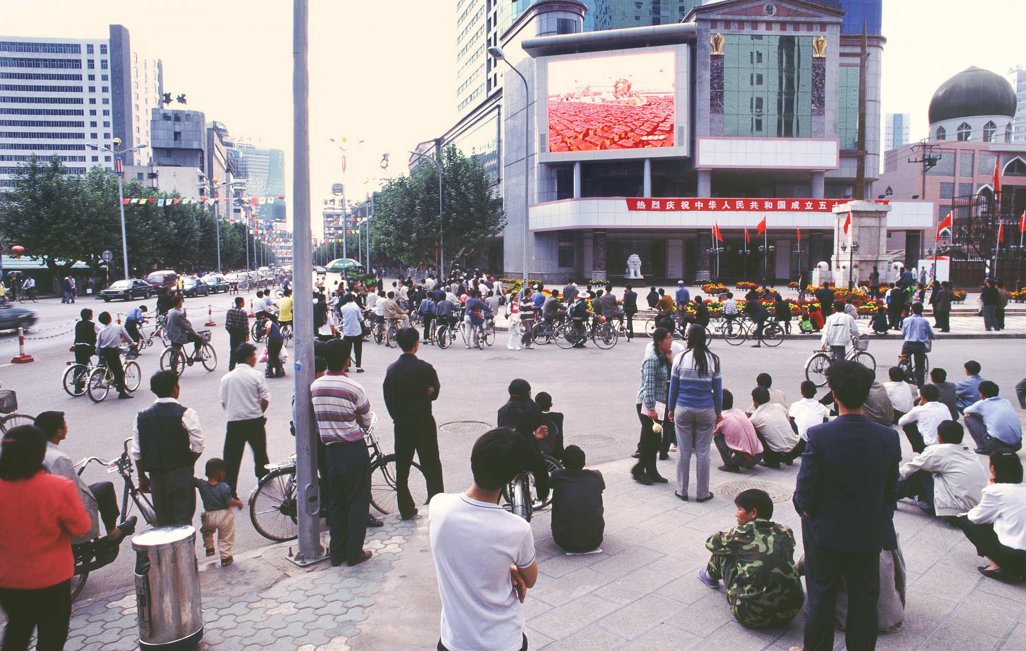 1999年10月1日,昆明南屏街东口华域大厦的电子大屏正在播放首都国庆游行实况,路过的市民纷纷驻足观看。刘建明摄