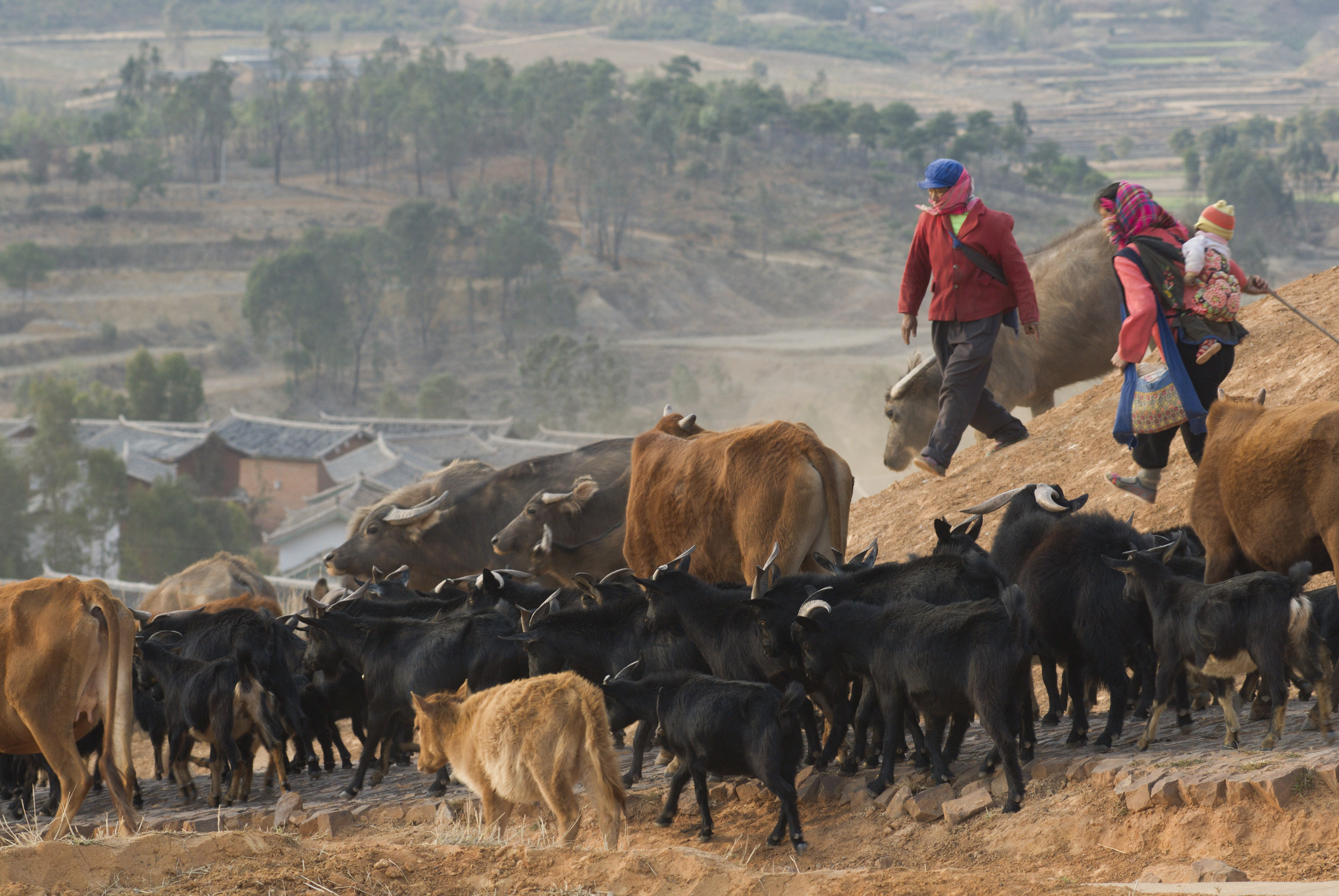 2008年,永仁县江边乡的余晖中,放牧的妇女赶着牛羊返回村庄。刘建明摄