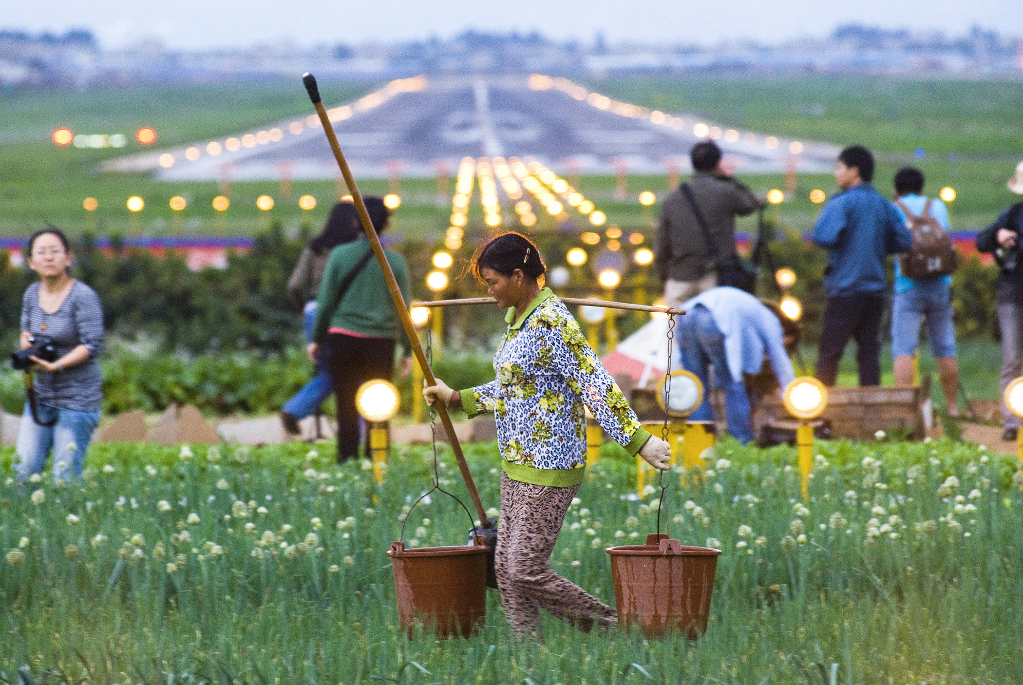 2012年6月25日,昆明巫家坝国际机场即将谢幕,黄昏中劳作的农民与守望的城里人形成了不同的对比。刘建明摄