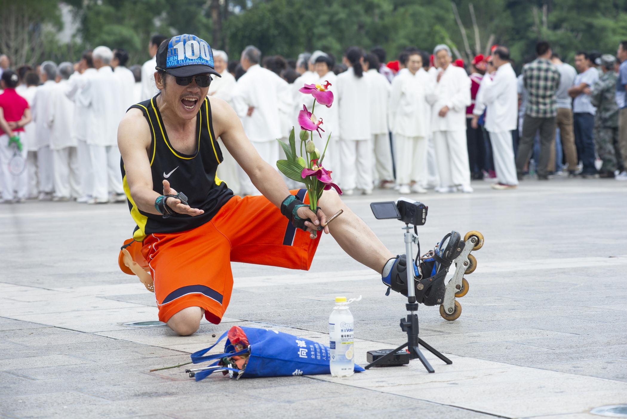 2014年,昆明碧鸡广场,一位脚蹬旱冰鞋,手执鲜花的健身者正沉醉在自娛自乐的自拍中。刘建明摄