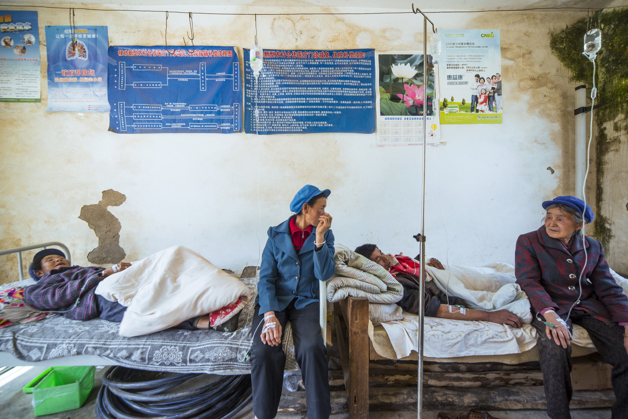 2014年,禄劝县转龙镇中槽子村卫生所,在一起挂吊针输液的村民。刘建明摄