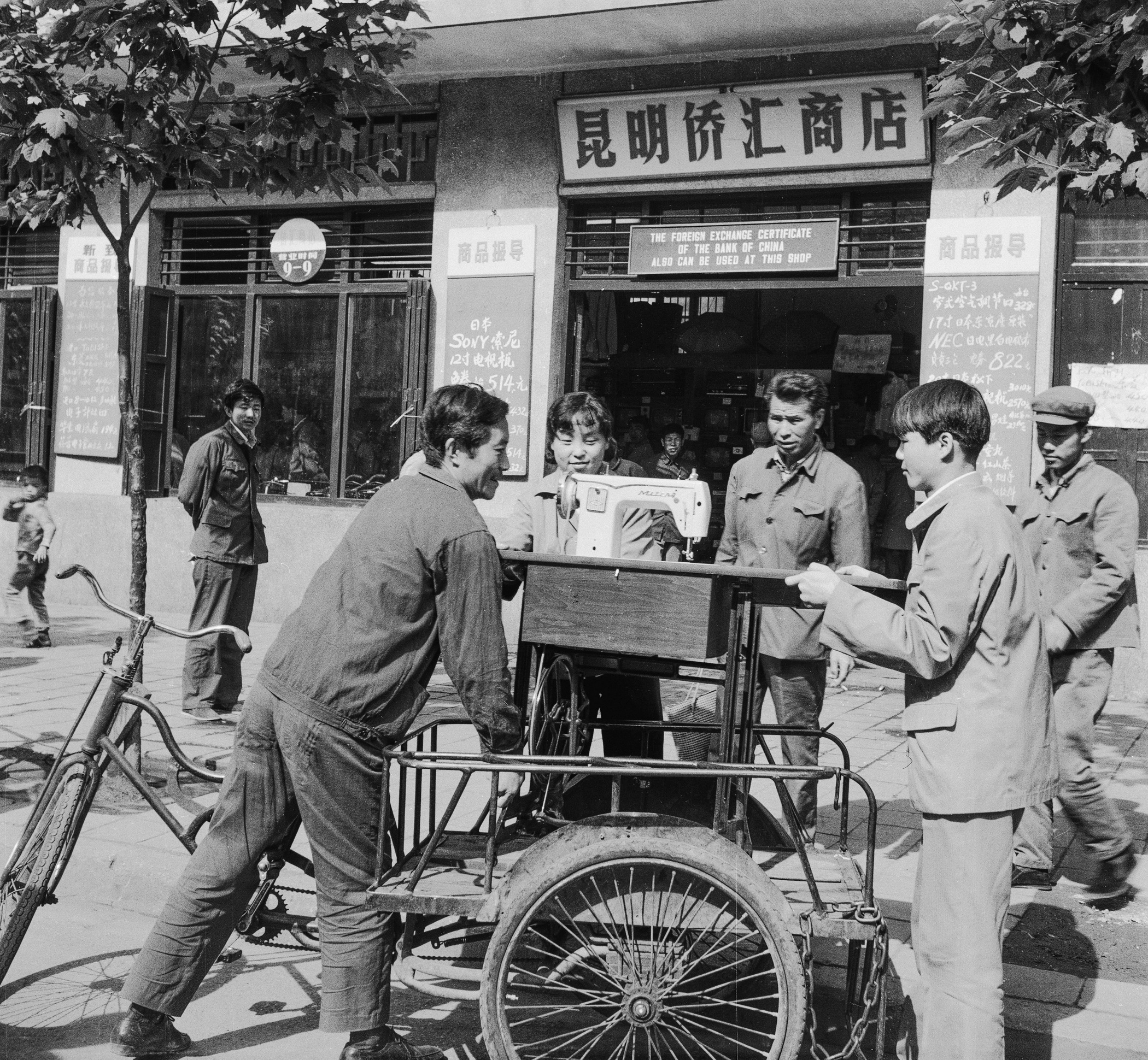 1971年,手表、自行车、缝纫机被称为“三大件”,需凭票购买。在昆明侨汇商店,市民凭外汇劵也可购买到缝纫机。刘建明摄