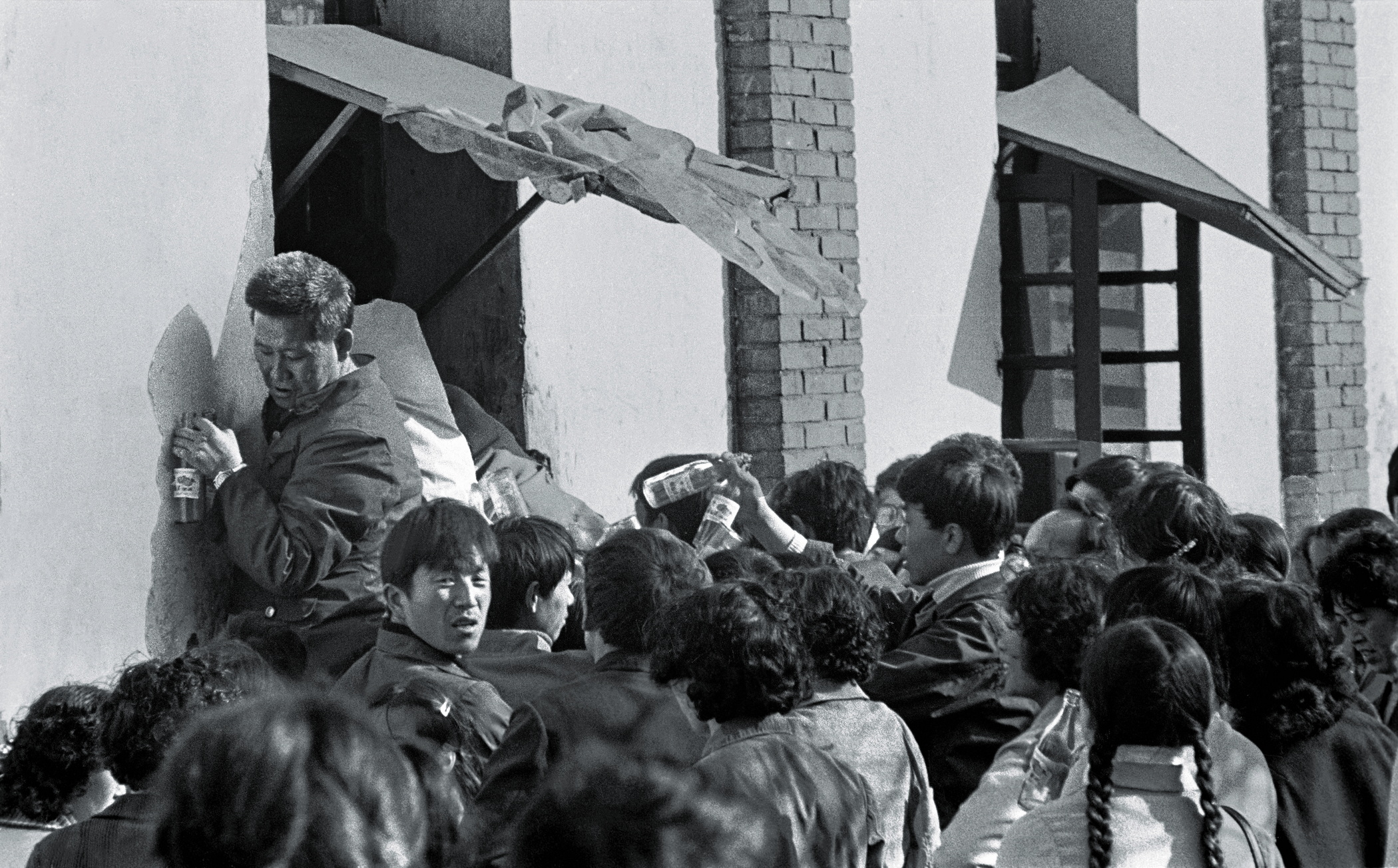 1974年,物资供应匮乏,在昆明圆通公园小卖部争购大观楼牌菠萝汽酒的市民。刘建明摄