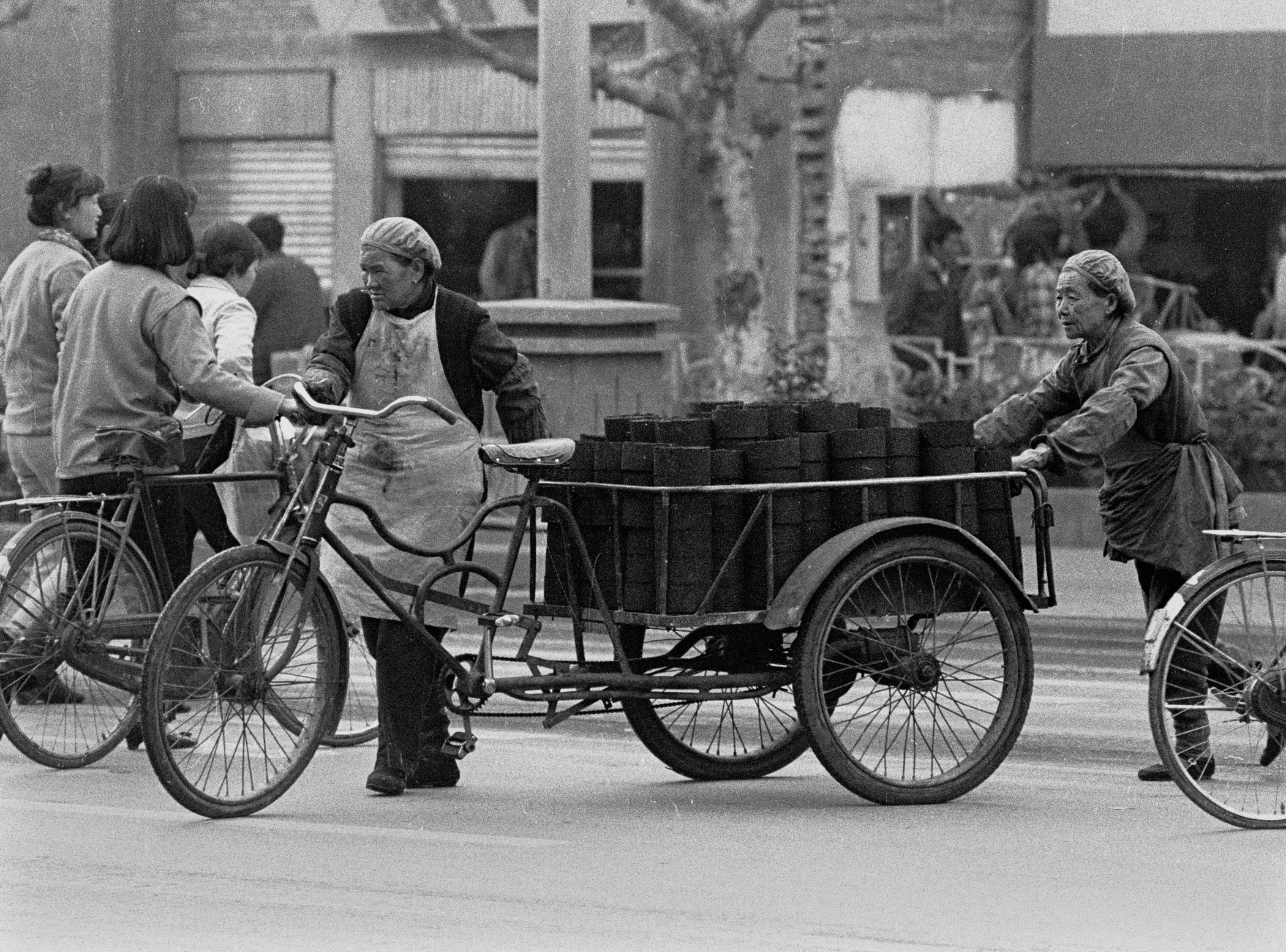 1978年,蜂窝煤是昆明城市居民生活的主要燃料,两位老人用三轮车拉蜂窝煤回家。刘建明摄