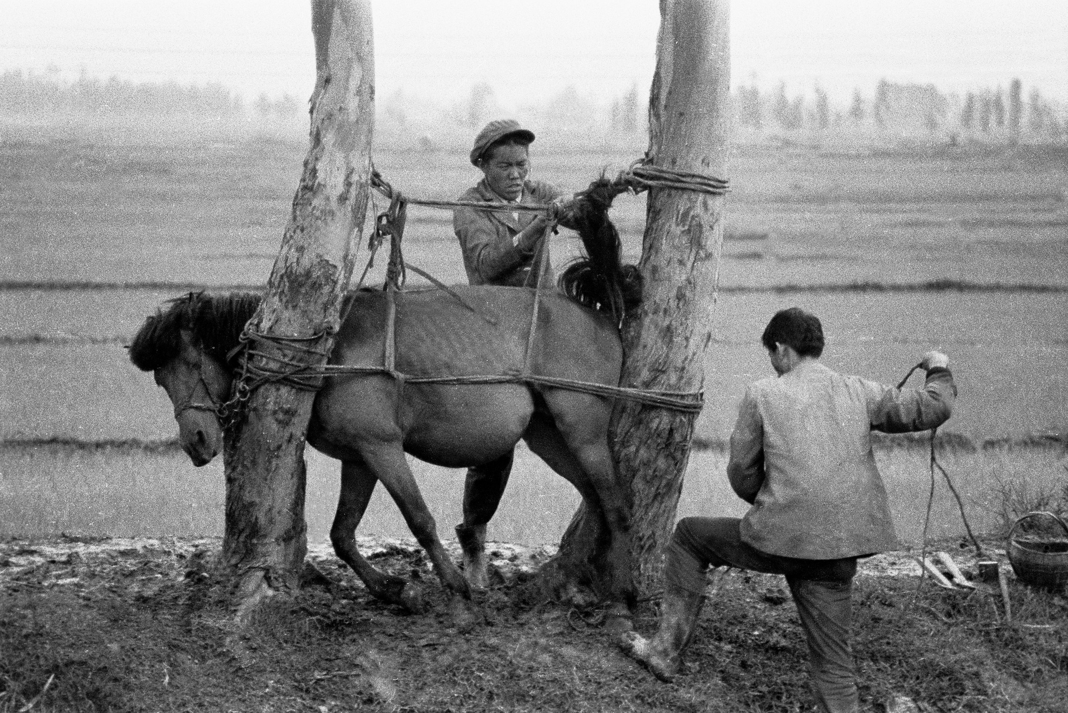 1978年,昆明郊区的田埂上,两个农民在作钉马掌前的准备工作。刘建明摄