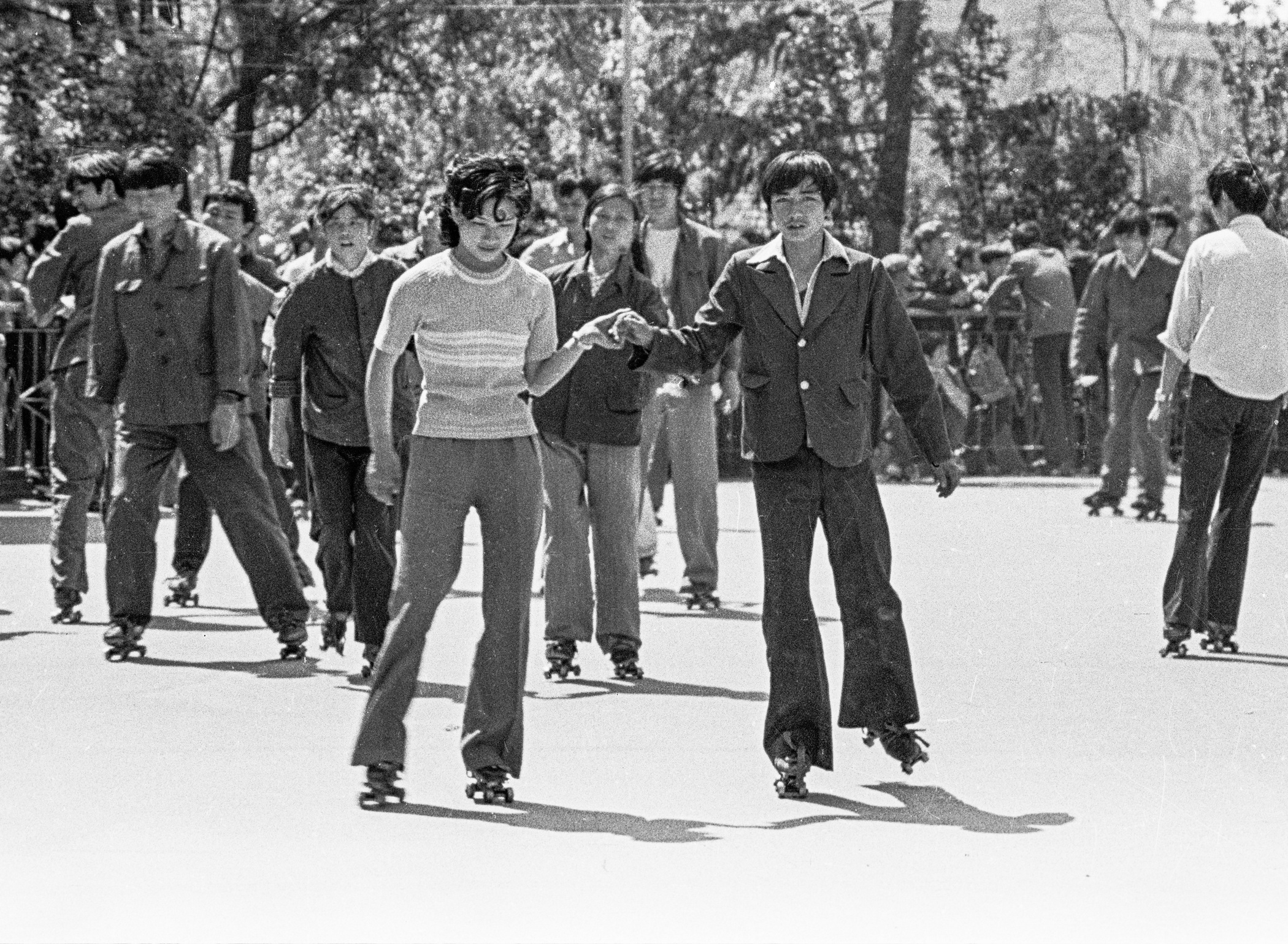 1981年,在昆明翠湖公园,穿喇叭裤溜旱冰的时尚青年。刘建明摄