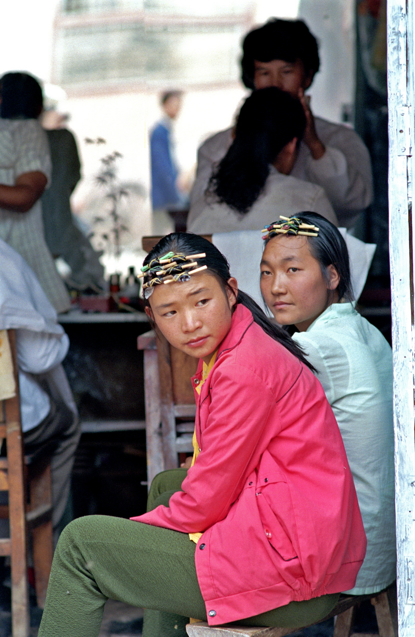 1985年,南涧县城的一家理发室,两个进城烫发的农村女青年神情安然。刘建明摄