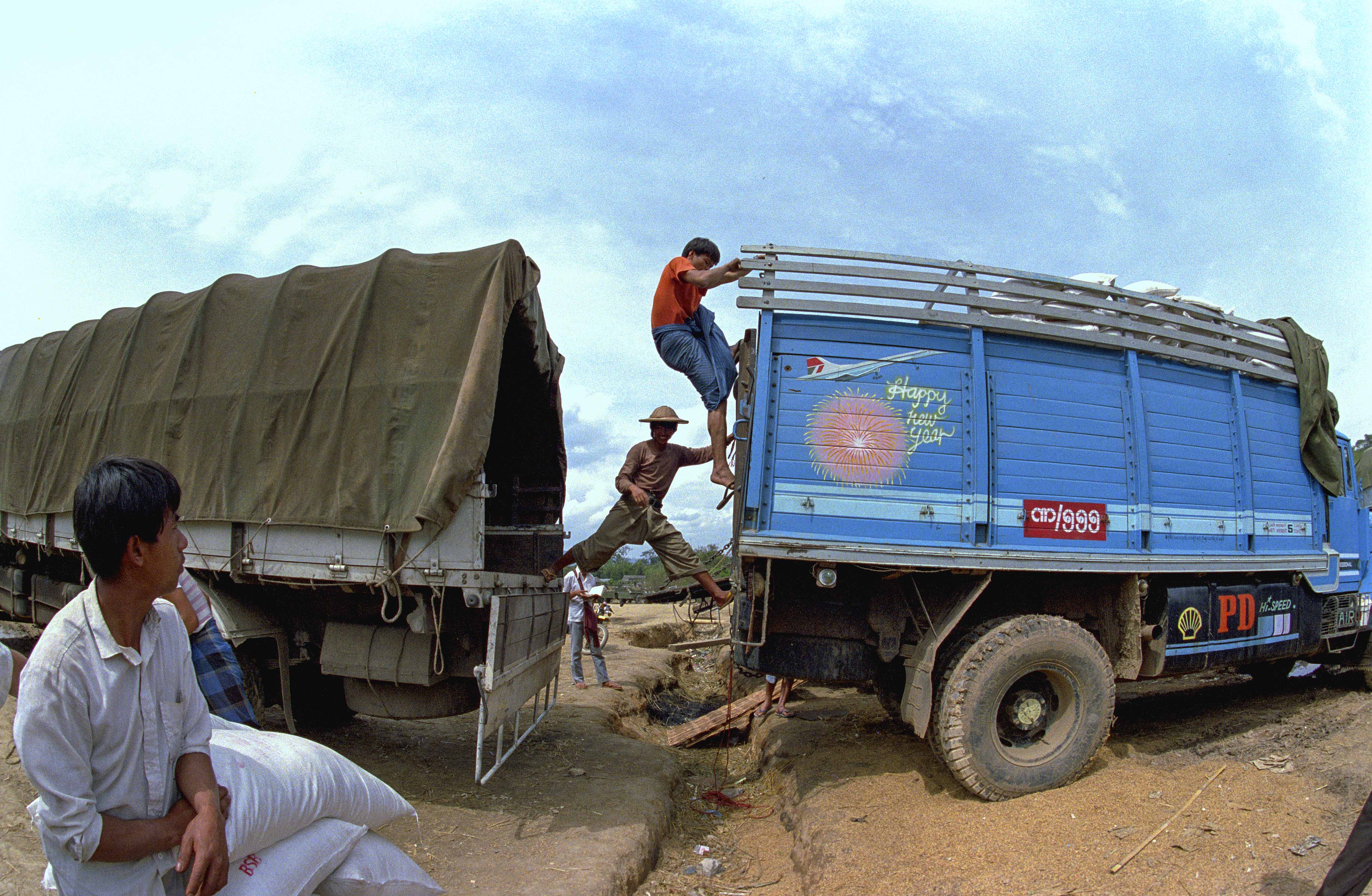 1990年, 瑞丽县姐告的一条小沟是中缅两国的分界,脚跨两国货车的缅甸装卸工在劳作,这是瑞丽国境线上早期独特的边境交易方式。刘建明摄
