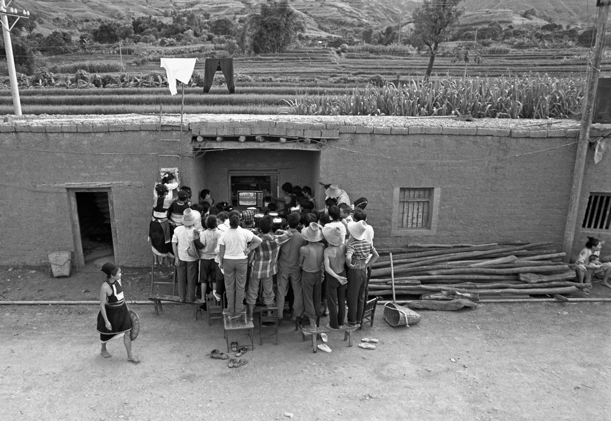 1991年,电视机刚在乡村出现,新平县漠沙乡的傣族群众簇拥在小卖部前观看录像节目。刘建明摄