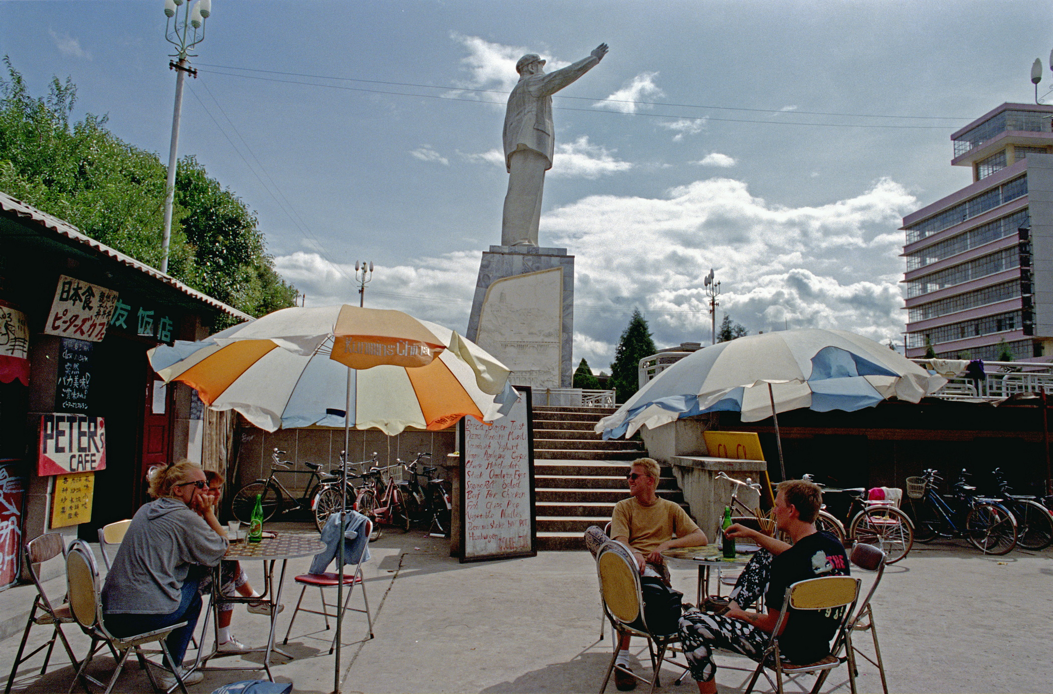 1991年,在丽江县城红太阳广场一侧,当地首家做西餐的小饭店常有外国游客光顾。刘建明摄