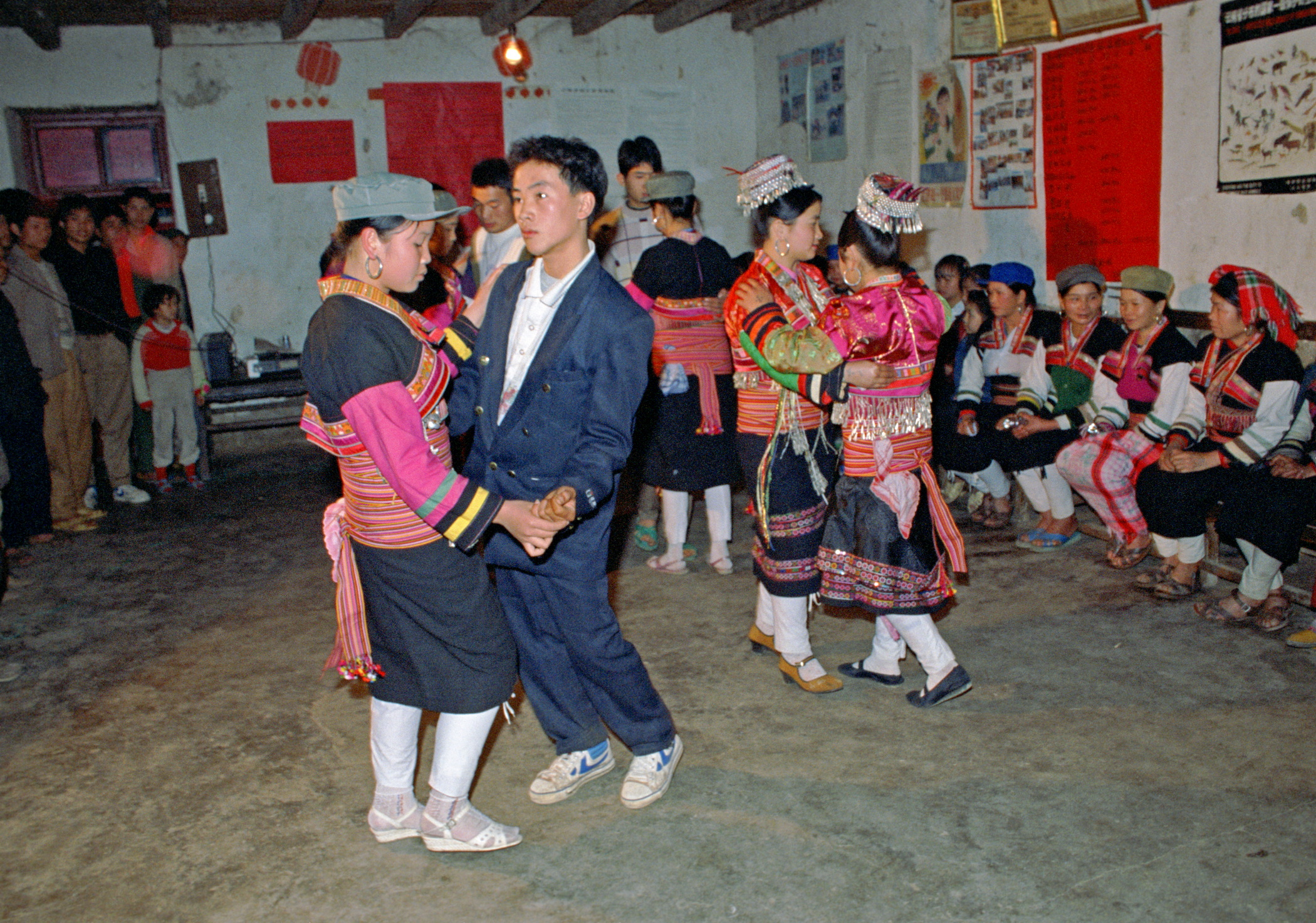 1993年,农村文化生活变化很大,新平县嘎洒乡平寨村的花腰傣青年在文化站里跳起了交谊舞。刘建明摄